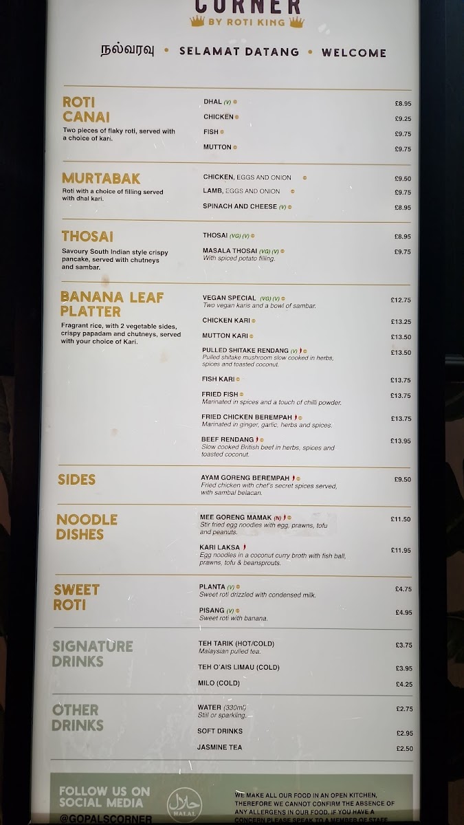Welcome to Gopal's Corner Victoria, a culinary gem nestled in the vibrant Market Halls of London. This delightful eatery specializes in authentic South Indian and Malaysian cuisine, making it a must-visit for food enthusiasts. The menu boasts tantalizing options like the crispy Thosai (£9.50) and the aromatic Masala Thosai (£10.50), perfect for those craving comfort food.